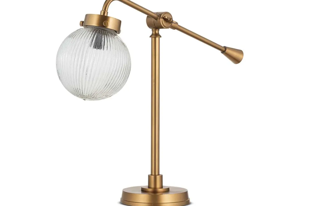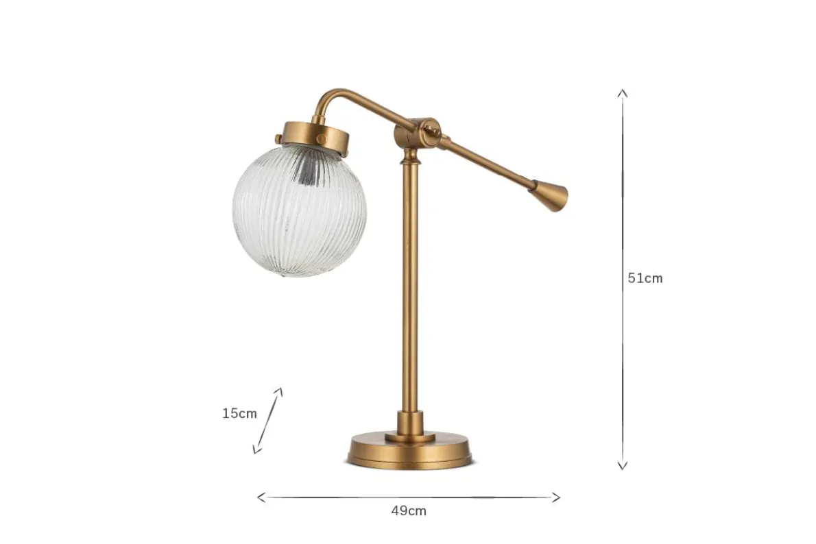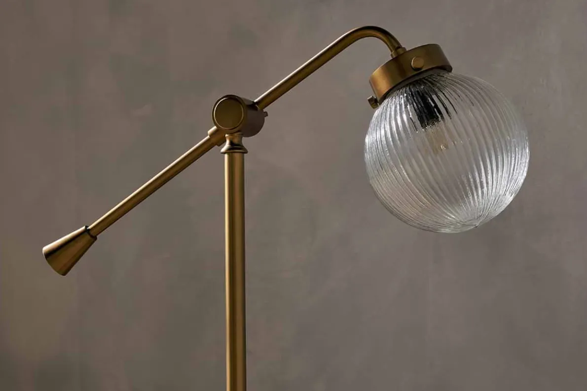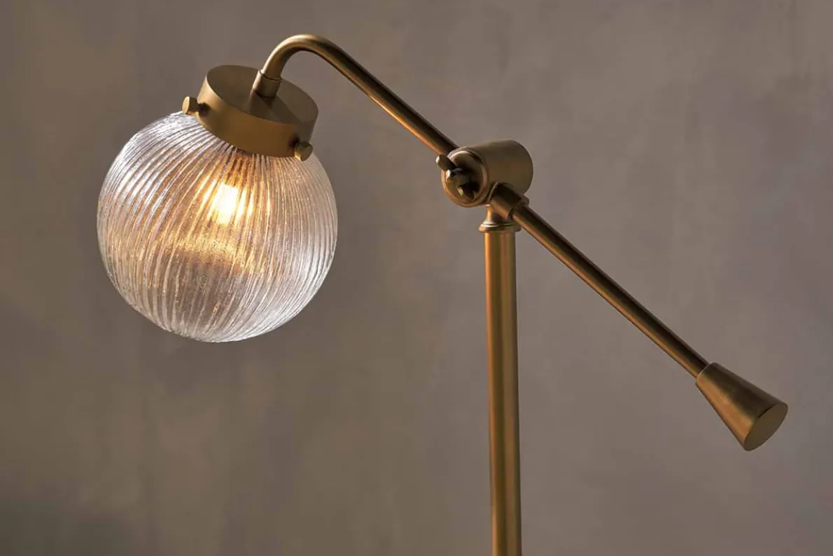 A beautifully practical and stylish lighting solution, our Sengol Desk Lamp has a ribbed glass globe that diffuses light in gentle patterns. Equally at home on a desk or sideboard, its height can be adjusted to make it fit perfectly in your space. Versatile and adaptable, featuring a combination of recycled glass and antique brass metal, our Sengol Desk Lamp adds ambiance and style.