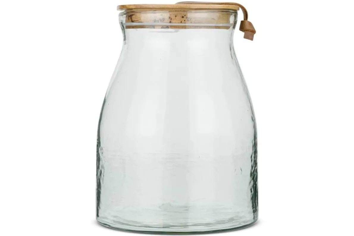 The Shaan glass storage jar is generously proportioned and can hold large quantities of oats, grains, pasta or cookies! The recycled glass base has an appealing hammered finish, that adds depth to the jar. The organic shape of the jar is topped with a mango wood lid and leather handle. The leather has a tanned finish, dyed with vegetable extract.