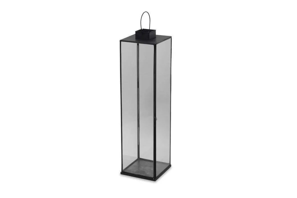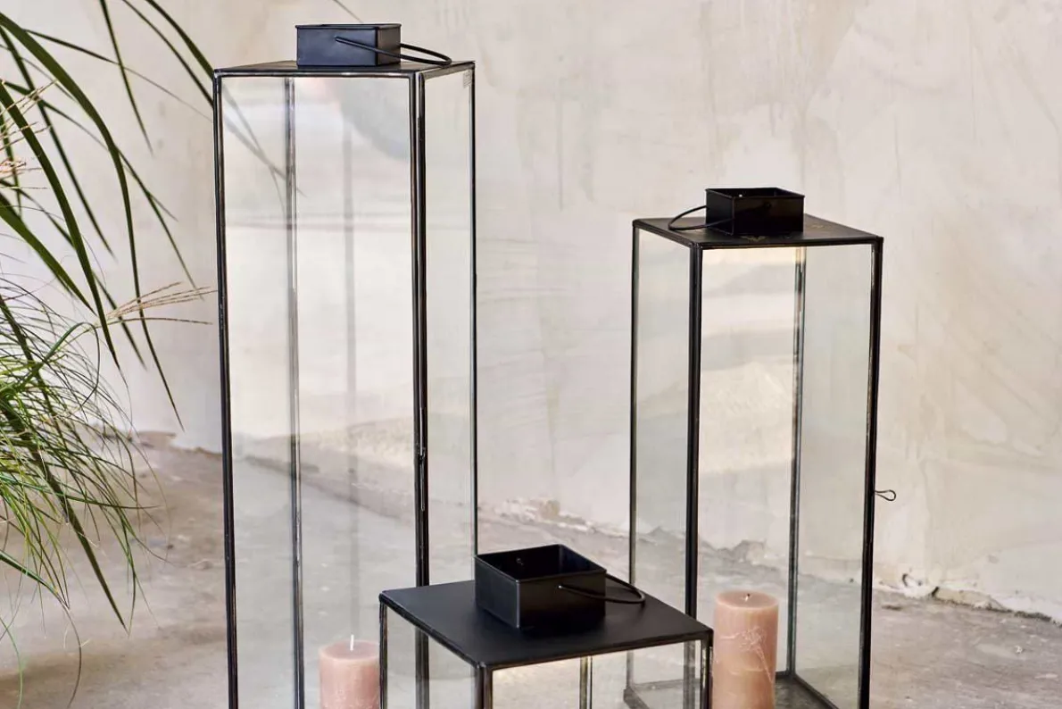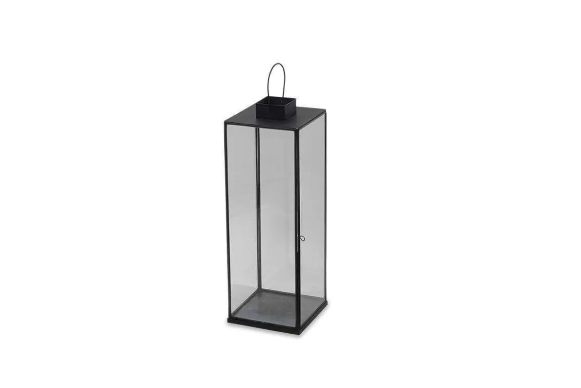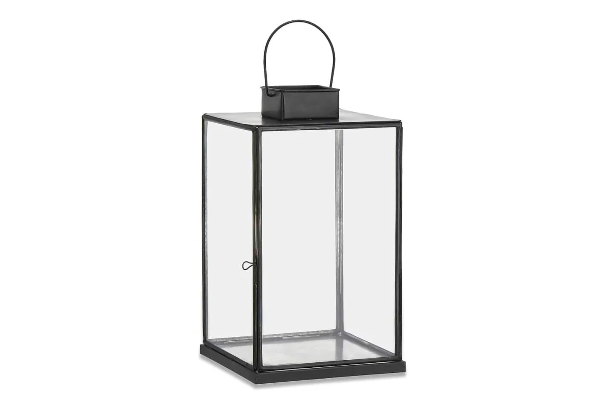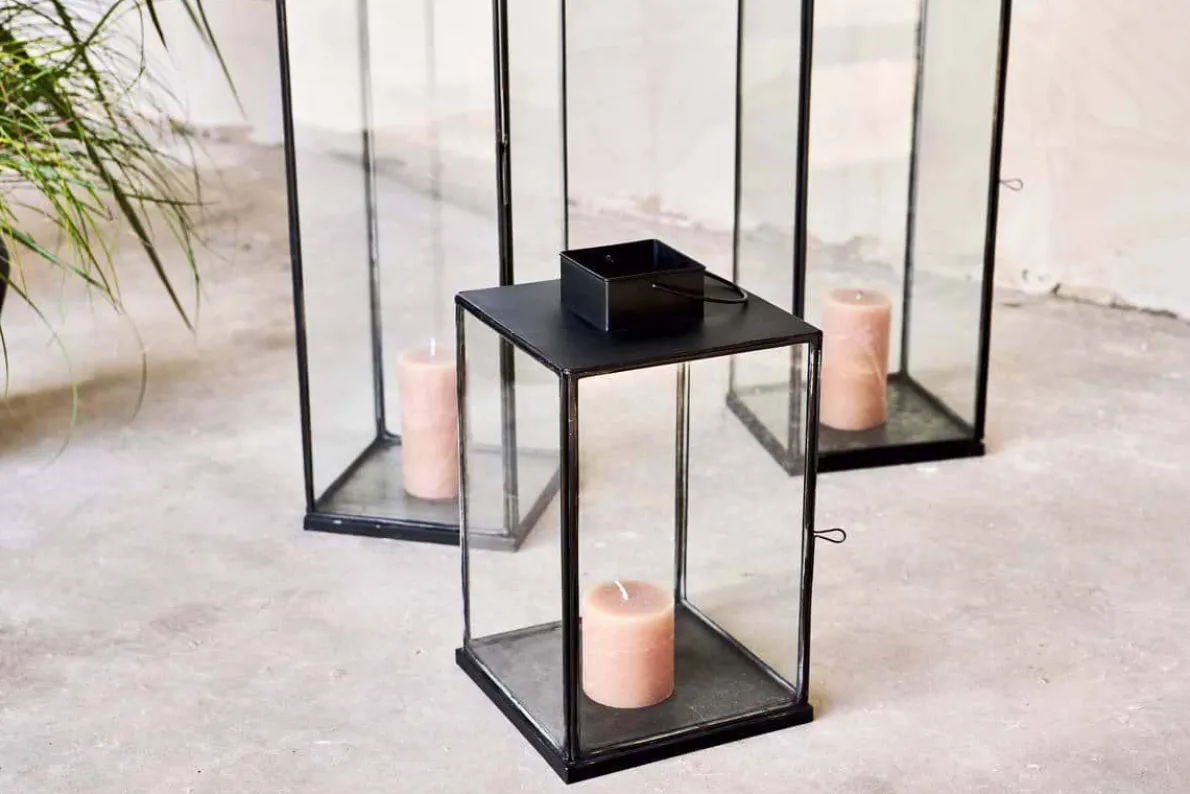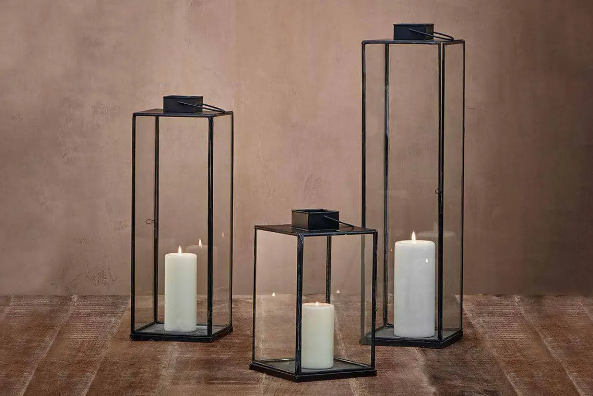 The elegant contours of our Sia lantern is enhanced with the antique black metal finish. This striking frame holds the tall glass panels and provides the perfect silhouette for a church candle or t-light.