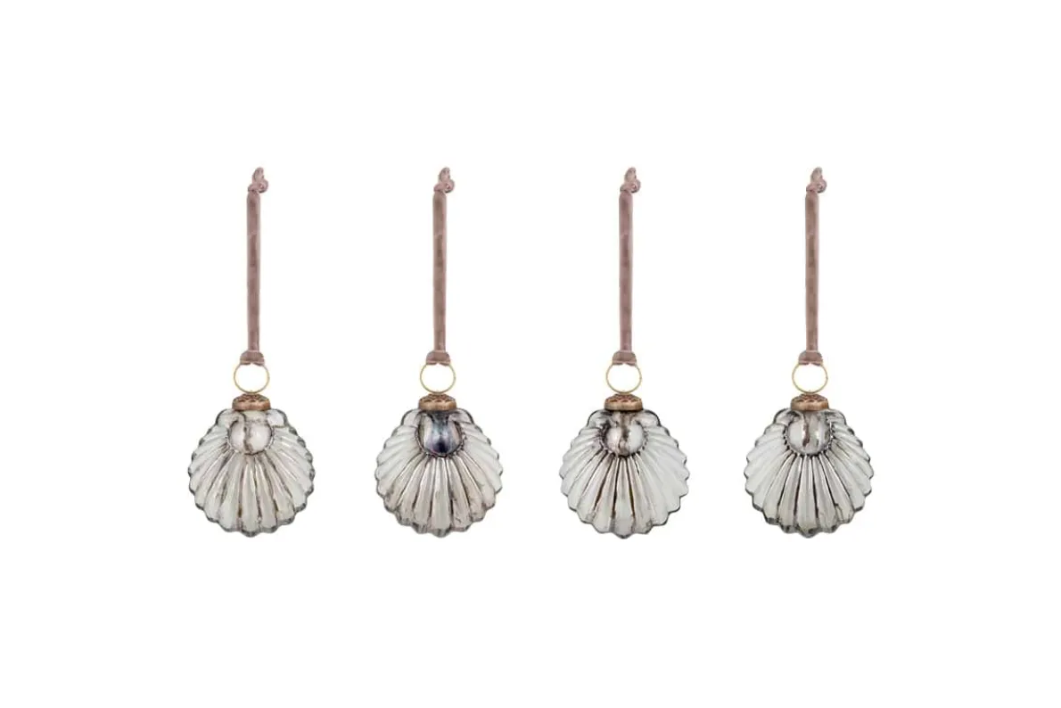 Our set of 4 Sohni shell baubles echo the elegant gold and cream ribbed design threaded throughout our festive collection, creating a synergy and unity while offering an eclectic variety of shapes that take inspiration from the simple beauty of the natural world. The pale smoked glass looks striking against festive foliage, and their delicate size and form would be perfect as a repeat piece hung liberally for a truly stunning effect. Finished with an antique-style clasp and elegant velvet ribbon.