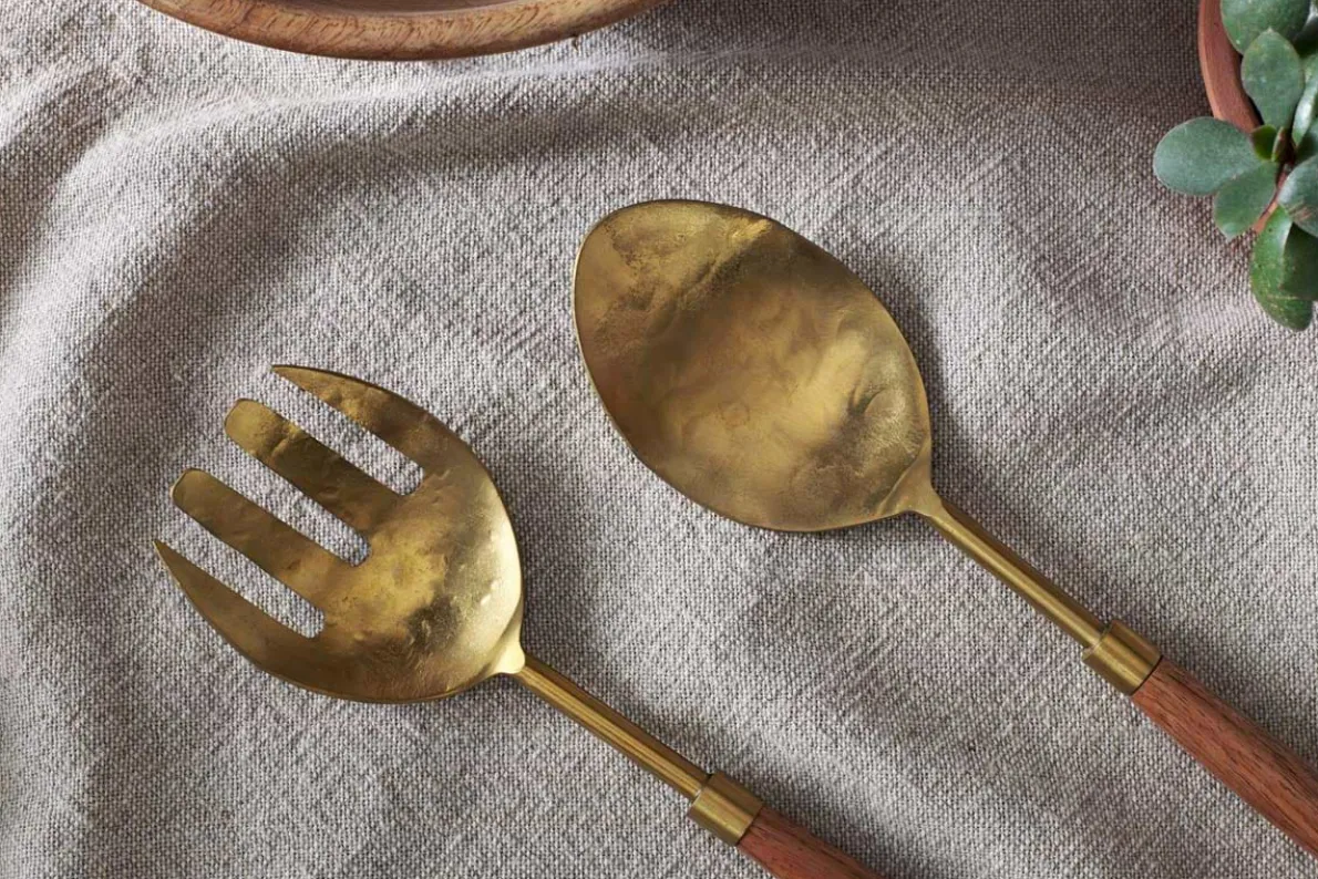Our Soni salad servers are a classic design that are as stylish as they are functional. Made from stainless steel with a gold finish, the handles are carved from acacia wood that has a wonderfully warm hue that complements the warmth of the metal.