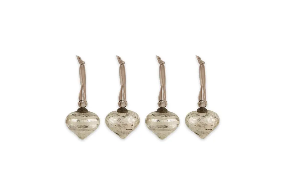 The exquisite shape of these Suhana baubles is thanks to the traditional methods used to create them. Each piece is expertly crafted from recycled, hand blown glass, where the artisans deftly coax molten glass into organic shapes. The baubles have a brushed silver finish and hand etched detail which gives them a classic antique feel. Hang them from the branches of your Christmas tree or string them together above your fireplace. They come in a set of four and are strung with a cotton velvet tie in a natural shade.