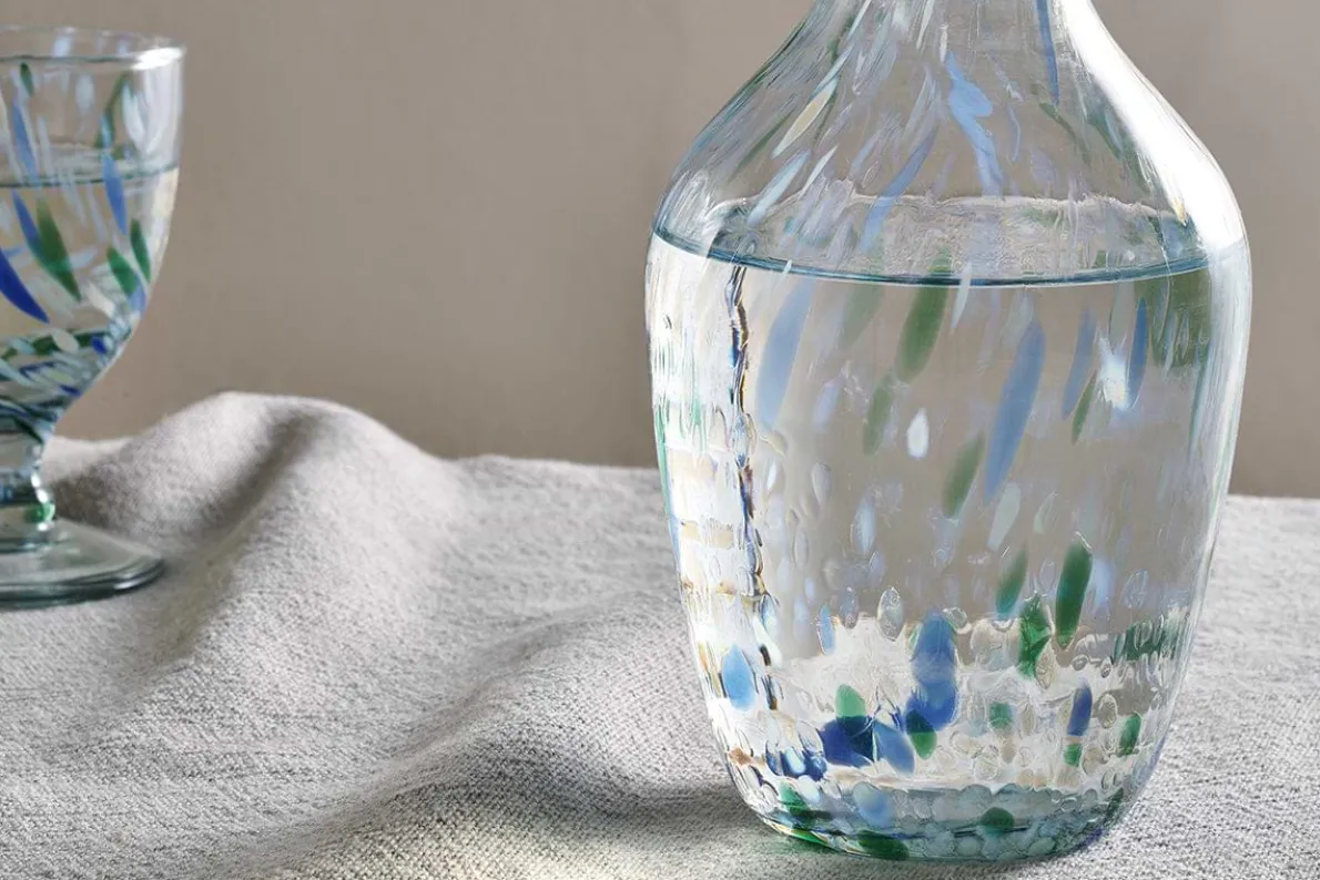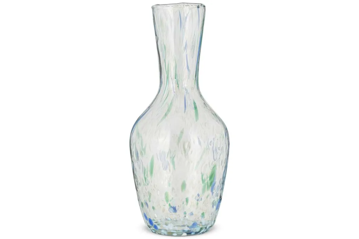 The mouth-blown, the recycled glass Taja Decanter brings a soft palette of fresh aqua tones in gentle blues and greens to instantly freshen up a table setting. Coloured glass fragments areintroduced to the clear molten glass, creating a free-flowing design and unique finish that is also highly durable as the pattern is contained within the glass itself. The stylish, organic design, with its sturdy form and gently uneven rim, heightens the individual beauty of each glass.