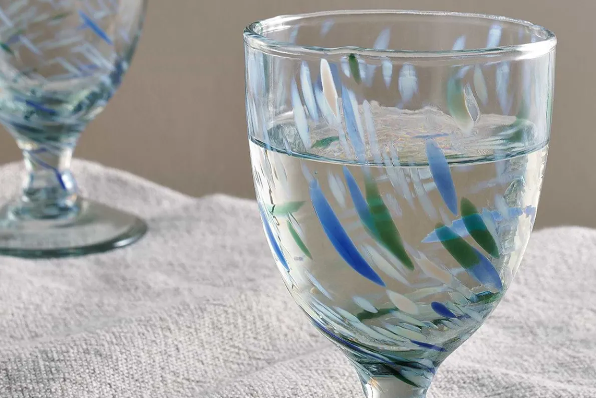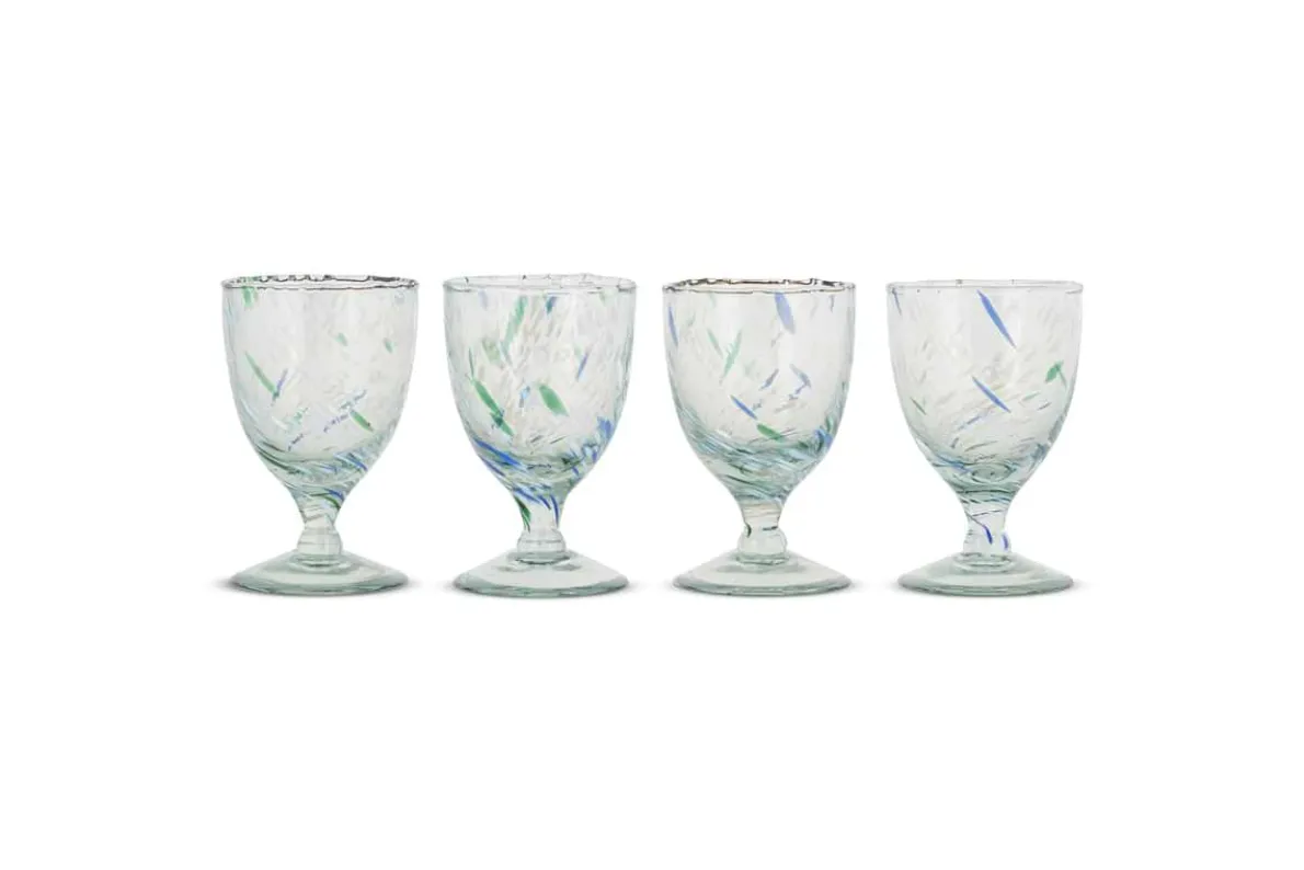 Each mouth-blown, the recycled glass Taja Wine Glass brings a soft palette of fresh aqua tones in gentle blues and greens to instantly freshen up a table setting. Coloured glass fragments are introduced to the clear molten glass, creating a free-flowing design and unique finish that is also highly durable as the pattern is contained within the glass itself. The stylish, organic design, with its sturdy form and gently uneven rim, heightens the individual beauty of each glass.