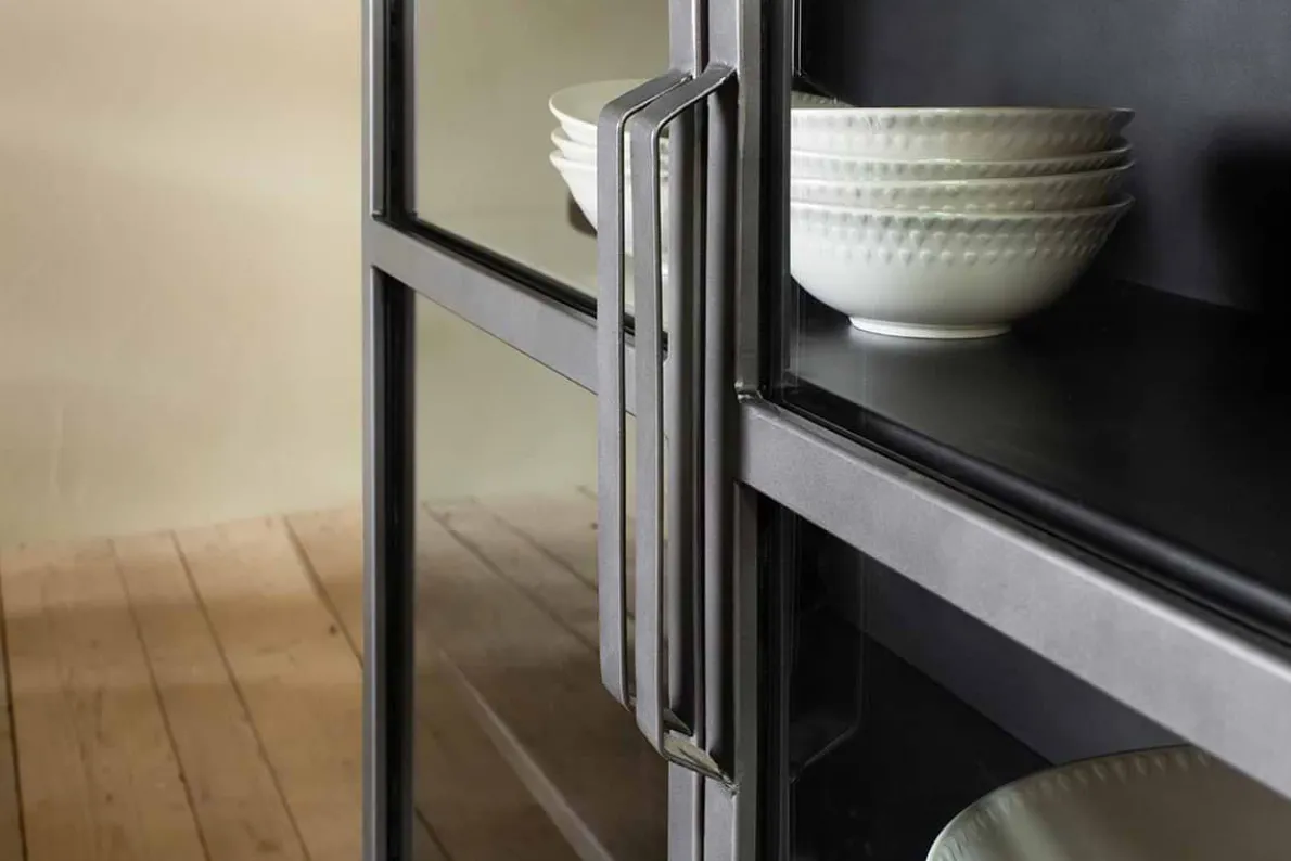 This sturdy and generously sized cabinet is ideal for displaying your favourite household items, such as glassware or crockery. Well-constructed from hard-wearing iron with clear glass-fronted doors, its pared back utilitarian design suits almost any interior. Its size ensures it’s an eye-catching addition to your home while the dark grey tones add a sophisticated note. This is a truly timeless piece which is both practical and stylish.
