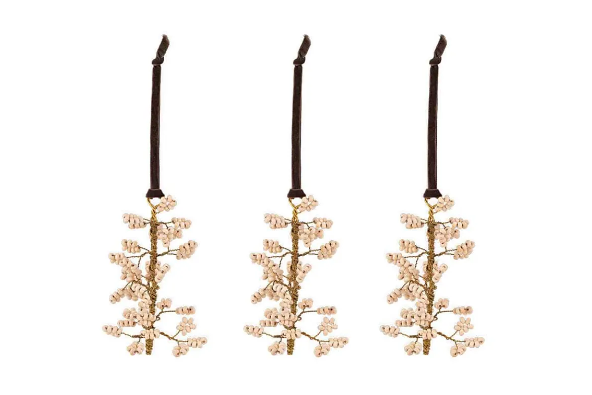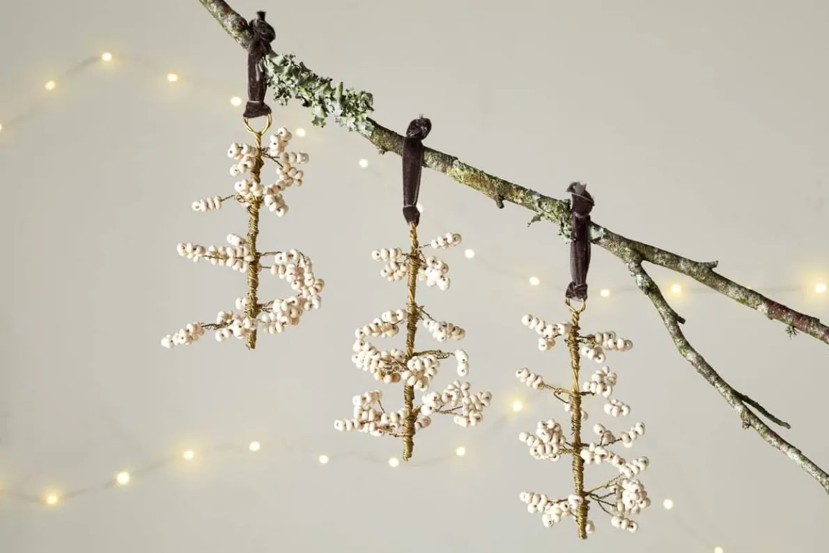 With a form that echoes the shape of a Christmas tree, these decorative baubles combine mango wood beads and antique brass-coloured wire in a delicate, foliage-inspired design. Their soft texture and warm tones add a natural elegance to festive trees, garlands, or table settings.