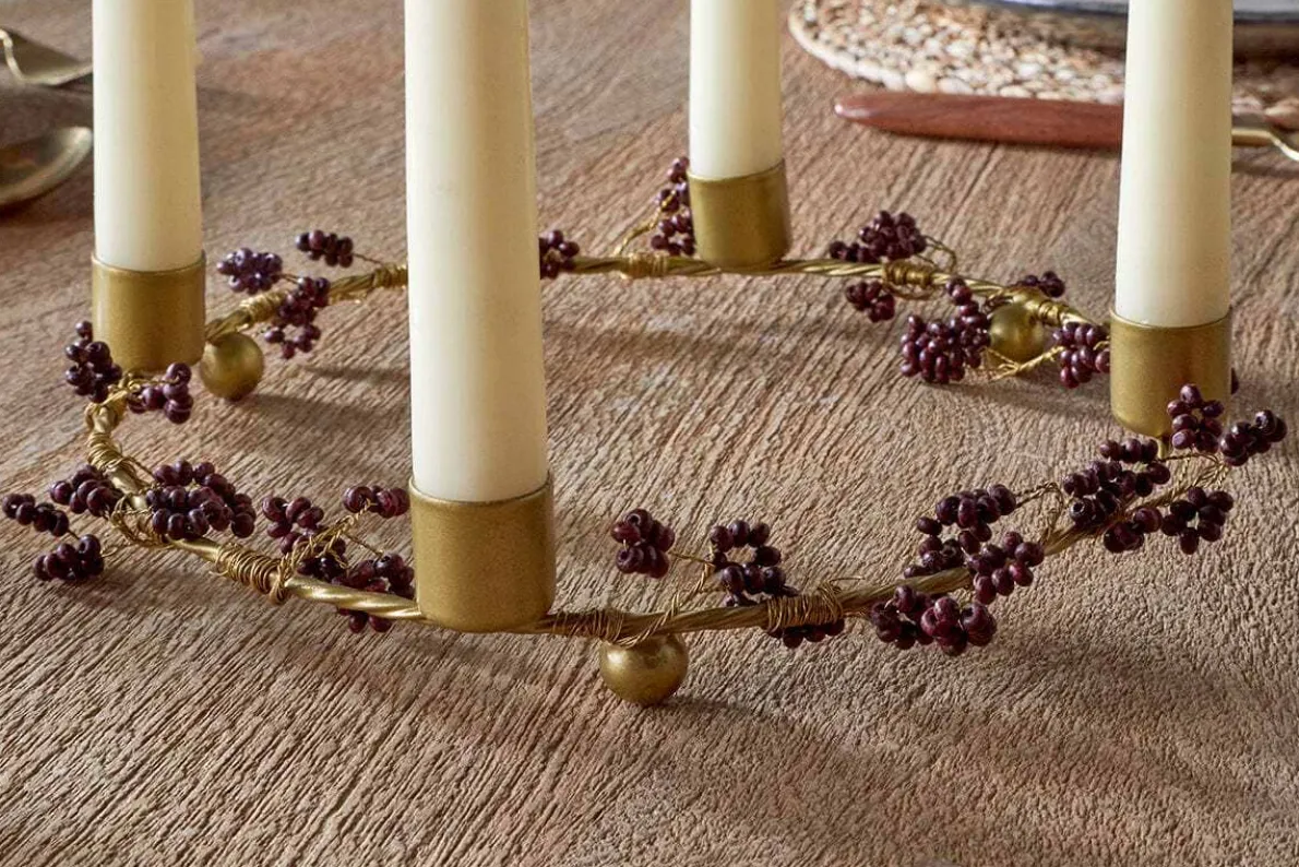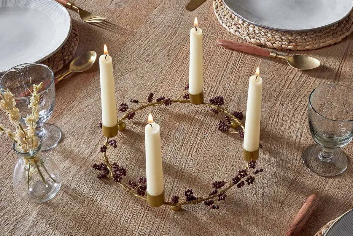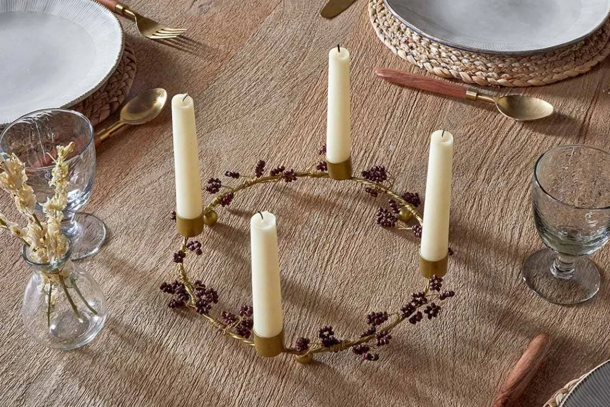 With its delicate, foliage-inspired design, this candle holder brings texture and warmth to festive tablescapes. Mango wood beads in rich tones are paired with brass-coloured wire for a subtle metallic detail, creating a beautifully decorative accent for seasonal gatherings.