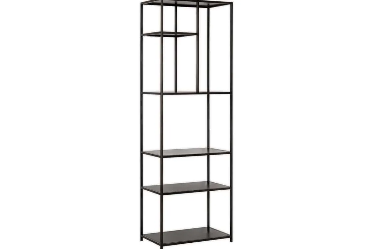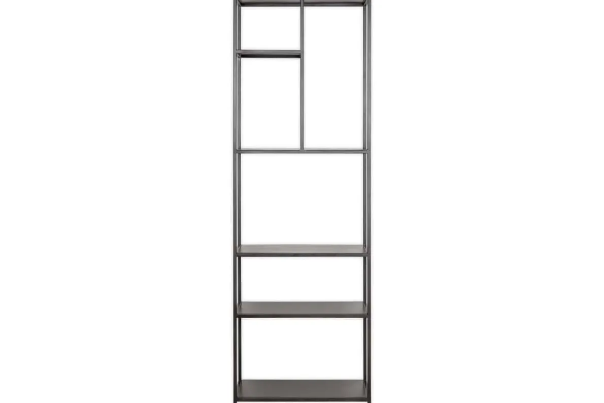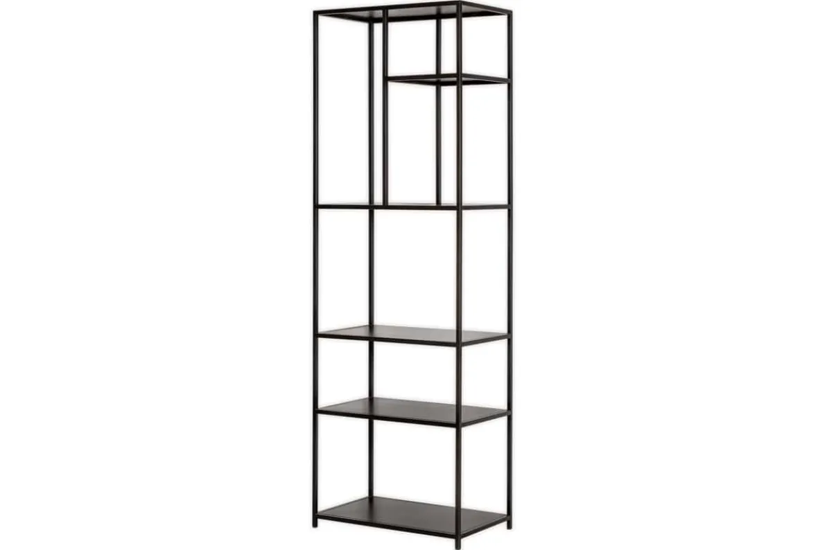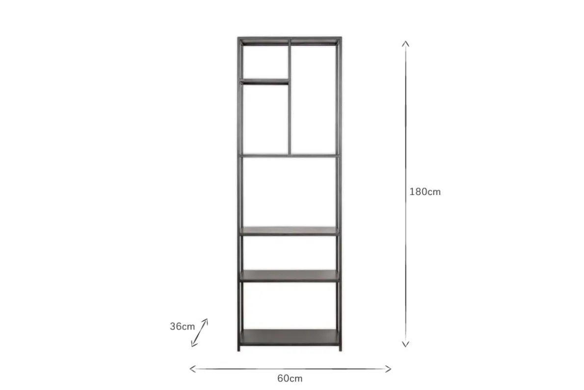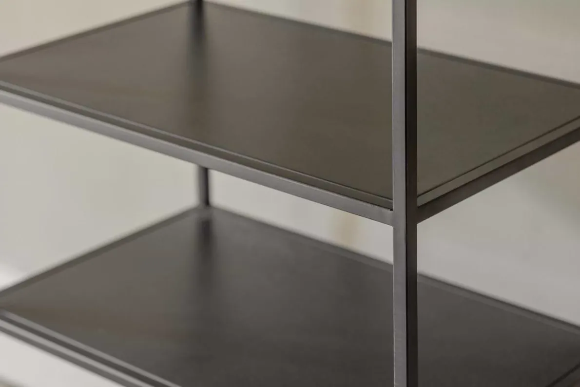 The Tavni narrow display shelf is a striking and versatile piece that has been designed with multi-tiered shelving options for visual pace and a contemporary aesthetic. Made from iron and finished in a matt antique black, this has an industrial feel, yet the delicate uprights keep the silhouette clean and uncluttered. As well as bringing extra shelving to a living space, hallway or bedroom, this piece could also be used as a room divider as it is dual-sided. Available in two sizes, it can be used as a standalone piece or together with other Tanvi display shelving.