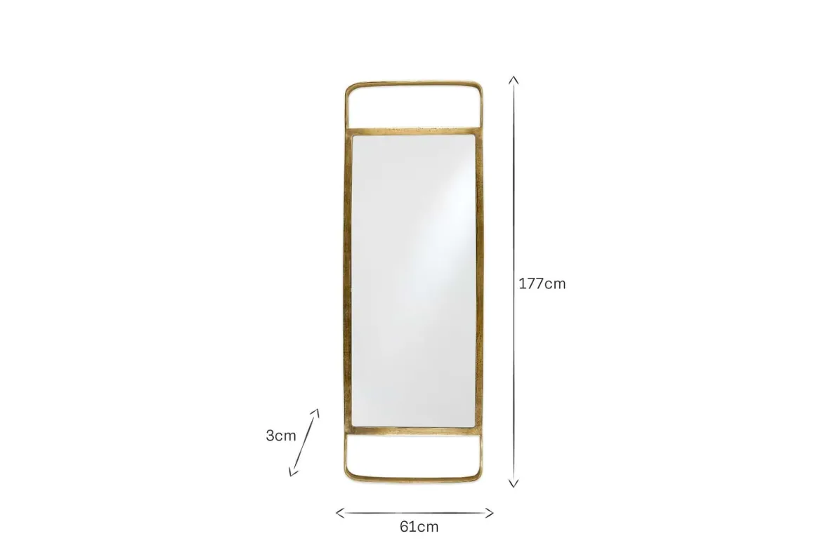 The Tarah full length antique brass mirror is an attention grabbing piece. The cast aluminium frame feels luxurious and heavy, the golden tones of the brass enhance this further, as does the textured finish that the casting process creates. This generous mirror would work well in a hallway, creating an illusion of space or adding light. Likewise its full length size make it ideal for a bedroom, providing a full length view. This mirror lends itself to being lent against a wall in a more relaxed style as well as being more formerly wall hung. Please note even when only leaning against a wall the mirror must be carefully secured.