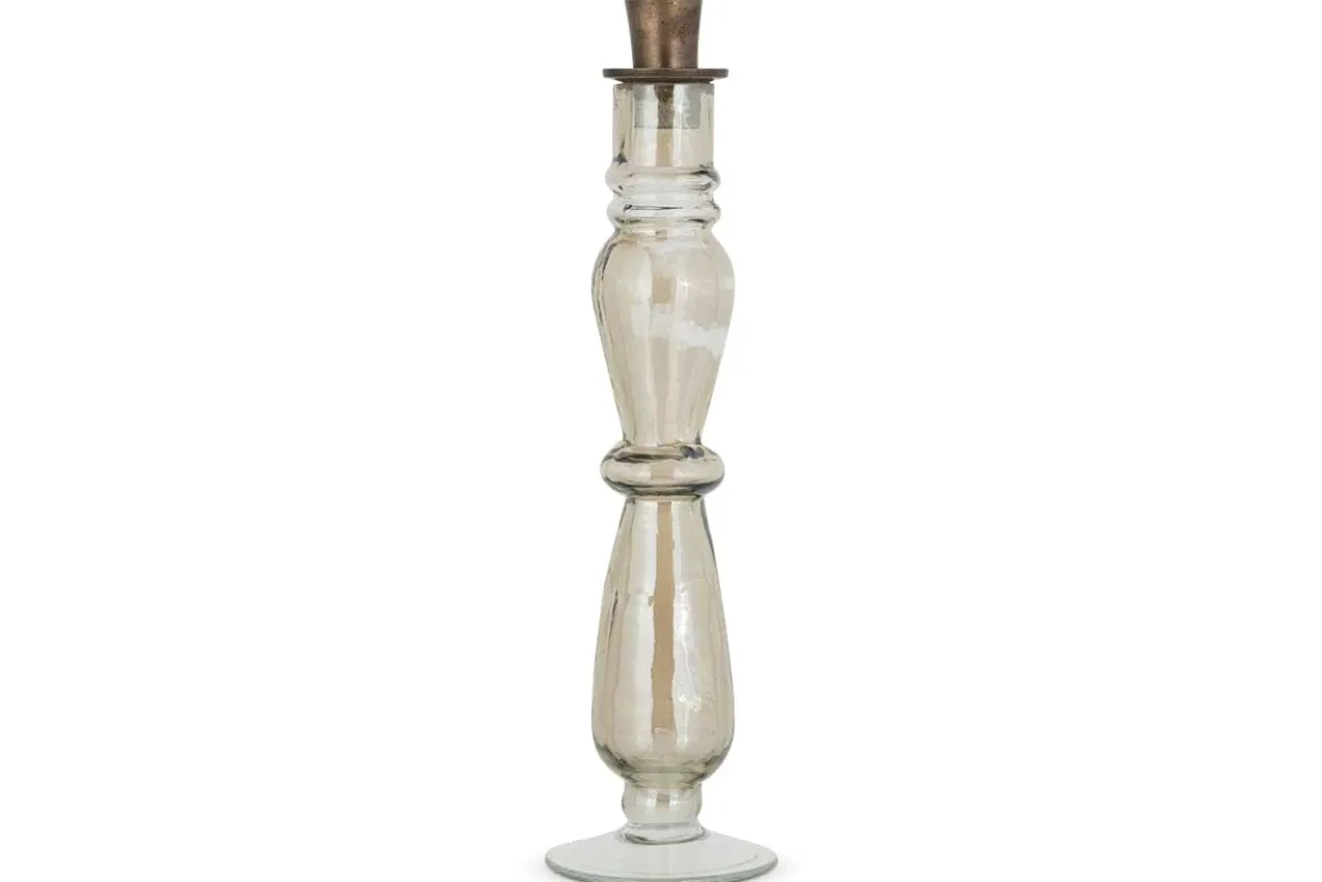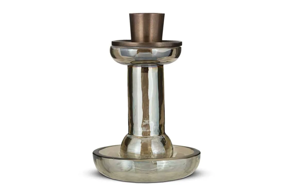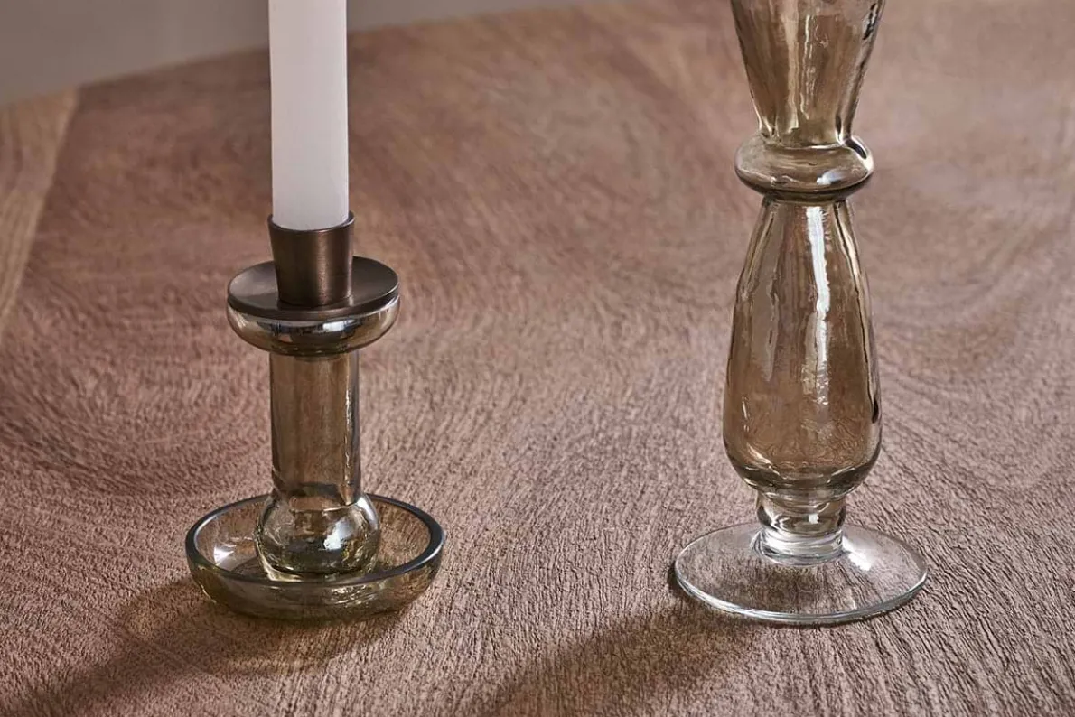 Our small Tharad Glass Candleholder has a beautiful lustre finish that makes it perfect for seasonal entertaining, adding a sheen and subtle sparkle to table settings. The chunky dimensions and interesting vintage shapes bring charm and visual stand-out, and thanks to the different styles within the range, the Tharad holders are a perfect way to add a quirky, mis-matched feel to your decor while the shared smoky lustre finish of the pieces creates a cohesive overall look. Mix and match with the large Tharad holder. Style with our dinner candles.