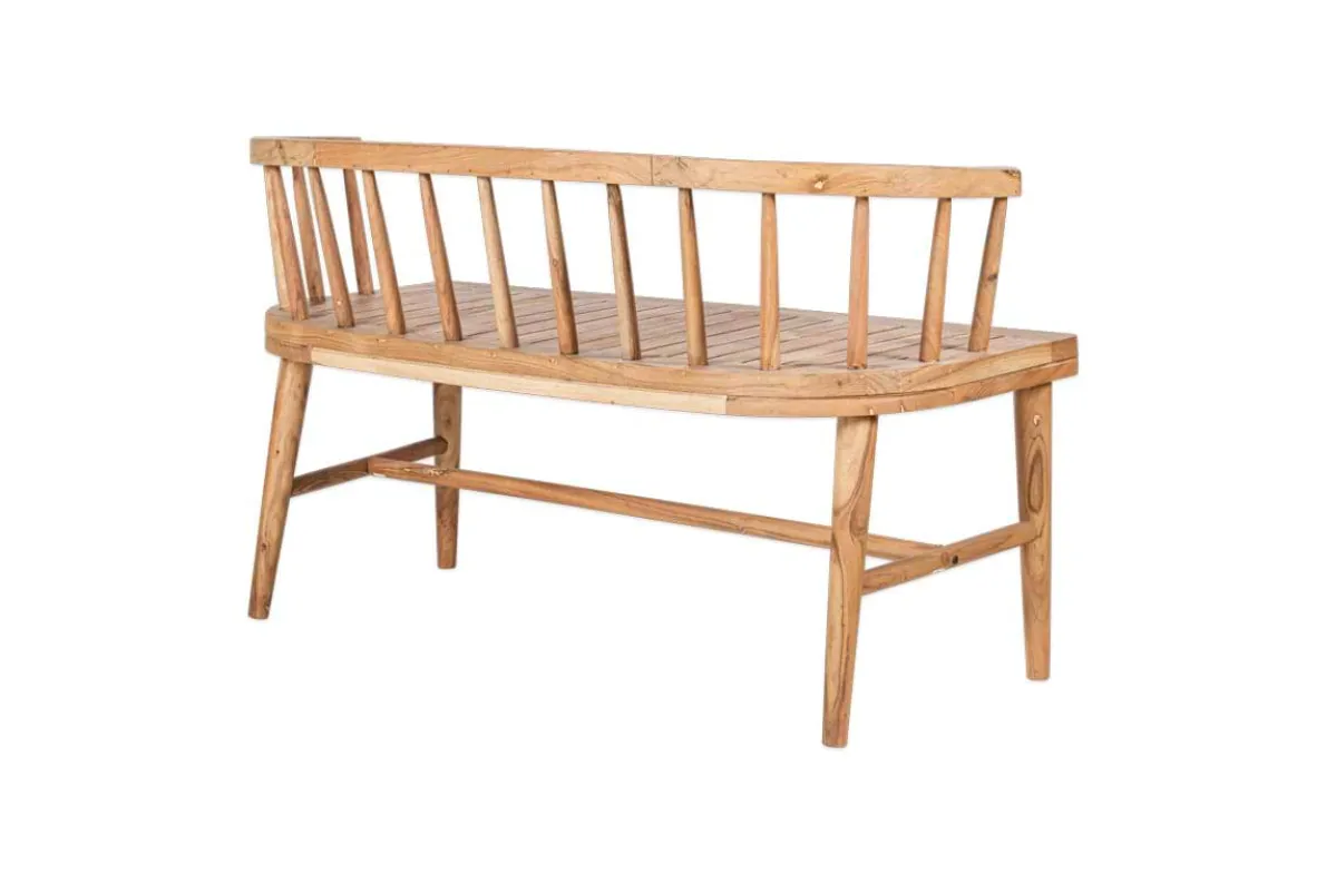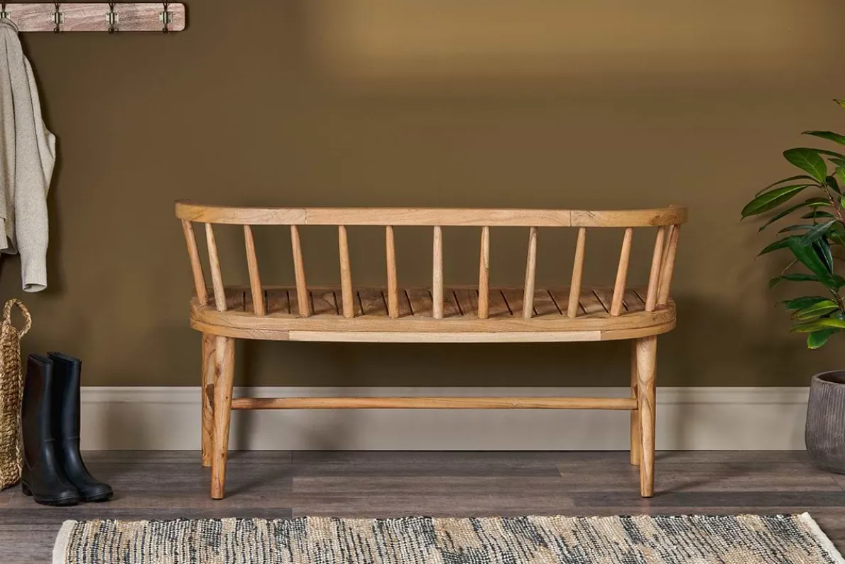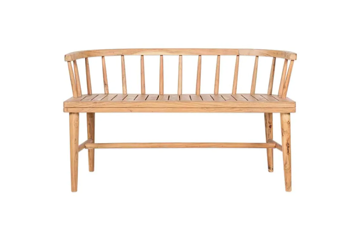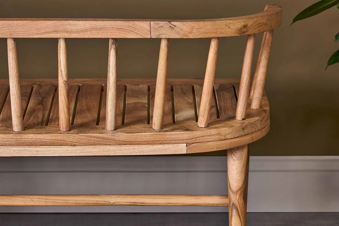 Our Shaker-style Tipu bench is hand-carved from Acacia wood giving it a warm tone, and sand-blasted for a textured look. Functional and stylish, this simple design, with tapered legs and gently curved back support, is ideal for a hallway or kitchen space, offering a timeless and versatile look.