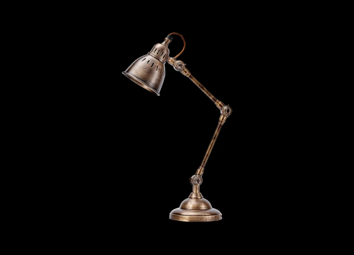 This perfectly proportioned Tubu desk lamp has an antique brass finish and adjustable head design. Its conical lamp head has a cut out design around its perimeter.