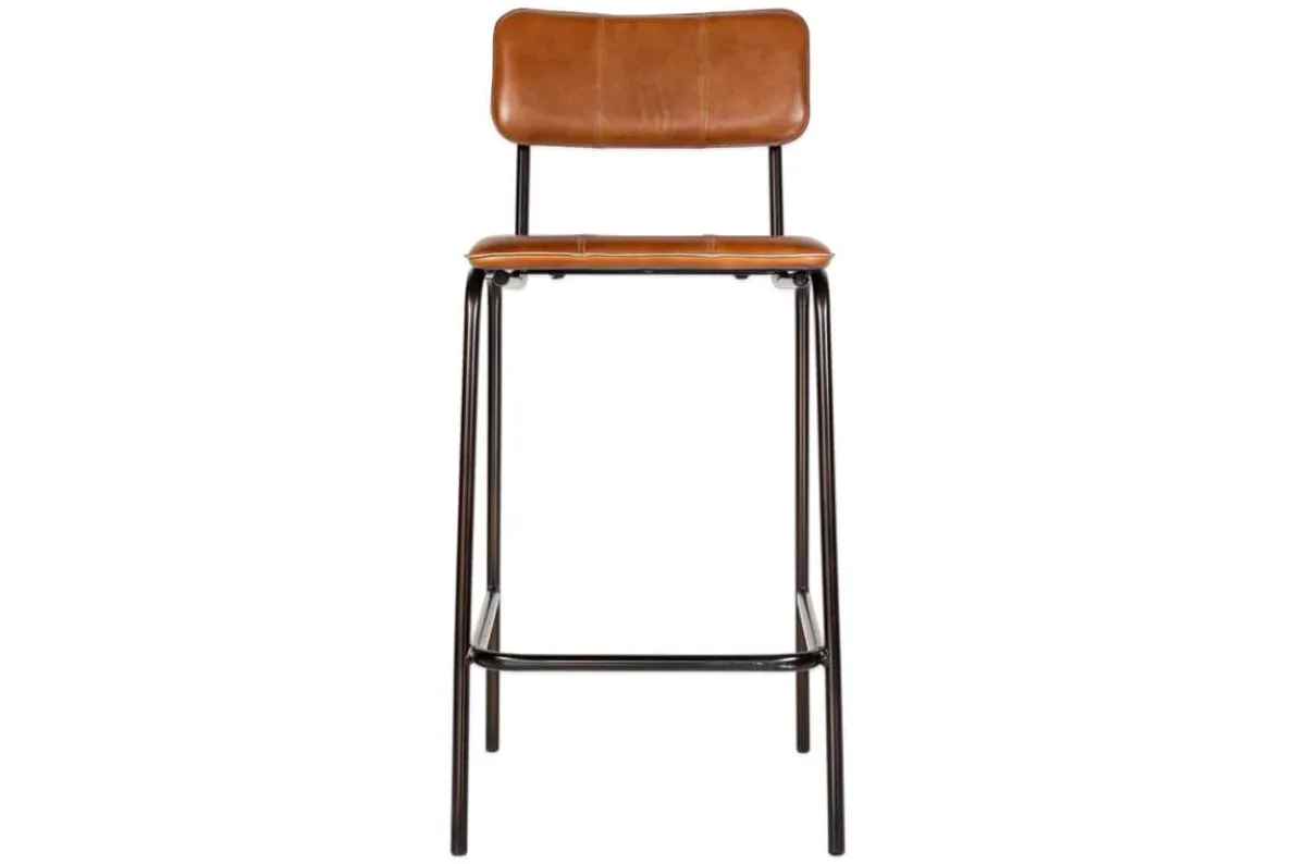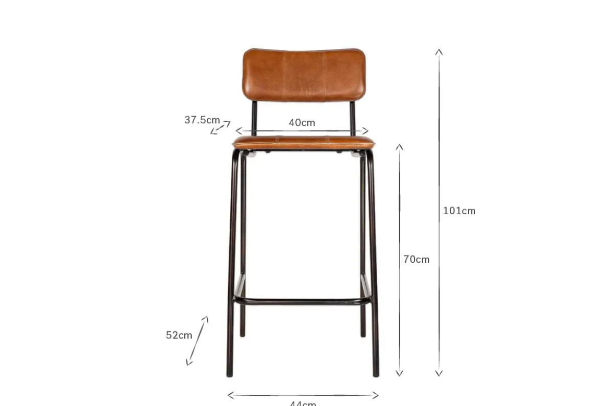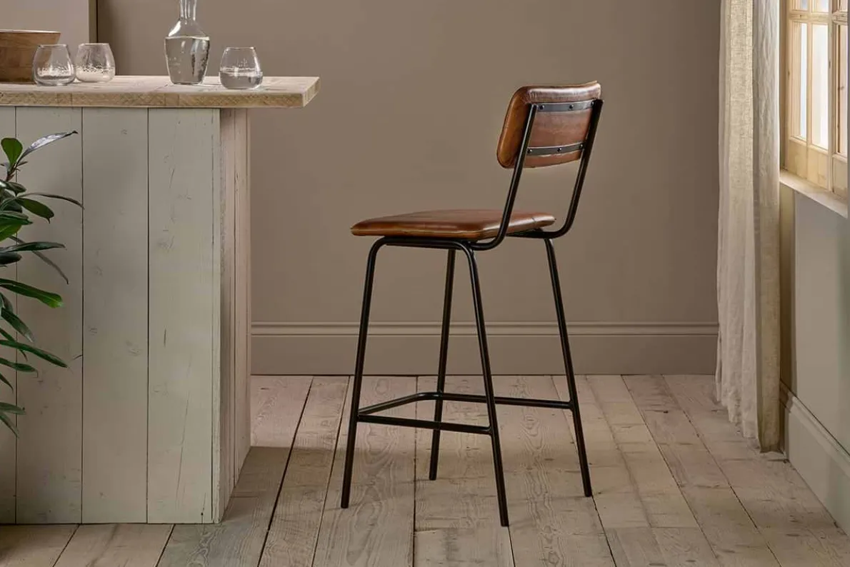 We’ve added this aged-tan leather counter-height bar chair to our best-selling Ukari collection. This practical, durable, and comfortable design has a simple, solid iron frame and footrest, and a padded seat and back support. Upholstered in handmade buffalo leather, it is stitched to create three panels which adds a stylish design detail to the piece. Designed to work with a kitchen island, counter or breakfast bar, the Ukari counter chair tucks neatly under a kitchen counter top. The leather upholstery is a by-product and is dyed using vegetable extract and tree bark which means the leather colour will enrich further with time. The Ukari collection includes dining chairs and counter stools in a selection of rich colours.