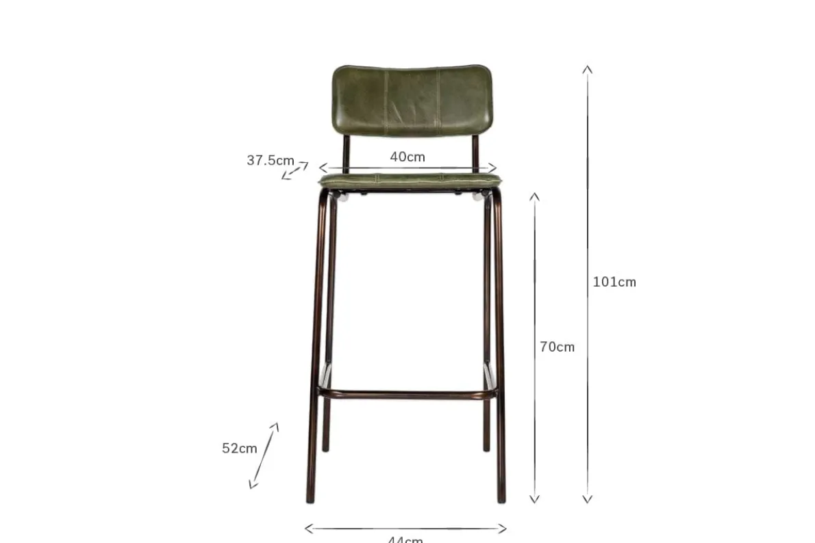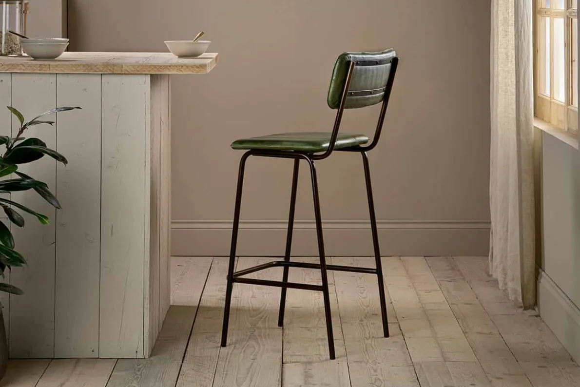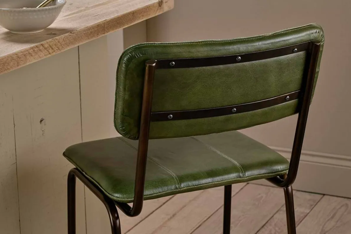 We’ve added this rich green leather counter-height bar chair to our best-selling Ukari collection. This practical, durable, and comfortable design has a simple, solid iron frame and footrest, and a padded seat and back support. Upholstered in handmade buffalo leather, it is stitched to create three panels which adds a stylish design detail to the piece. Designed to work with a kitchen island, counter or breakfast bar, the Ukari counter chair tucks neatly under a kitchen counter top. The leather upholstery is a by-product and is dyed using vegetable extract and tree bark which means the leather colour will enrich further with time. The Ukari collection includes dining chairs and counter stools in a selection of rich colours.