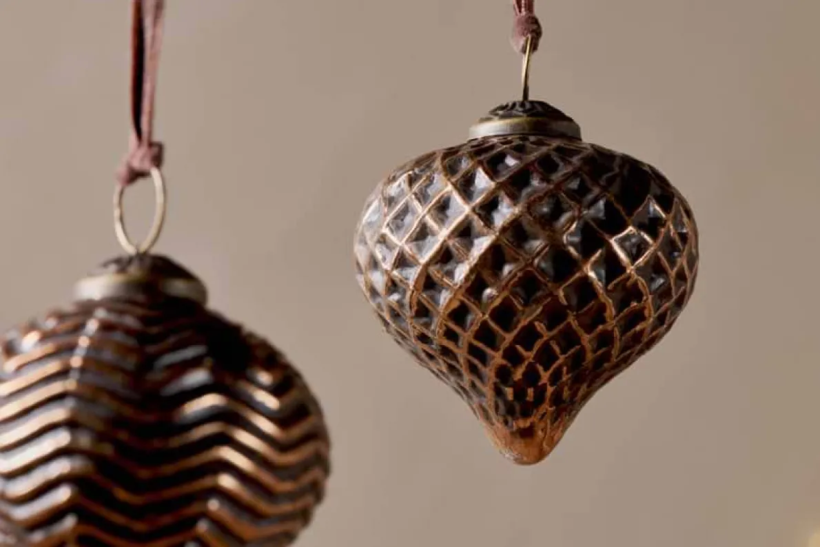 This elegant set of 4 Varu Baubles is made from recycled glass in a curved teardrop design with an antique gold and black finish featuring two designs, a loose wave and a hatched diamond that bring variation in appearance across a shared colour palette. The singular style make these decorations stand out when used exclusively in a scheme or add depth and differentiation when mixed with rich jewel-like shades. Finished with an antique-style clasp and elegant velvet ribbon.
