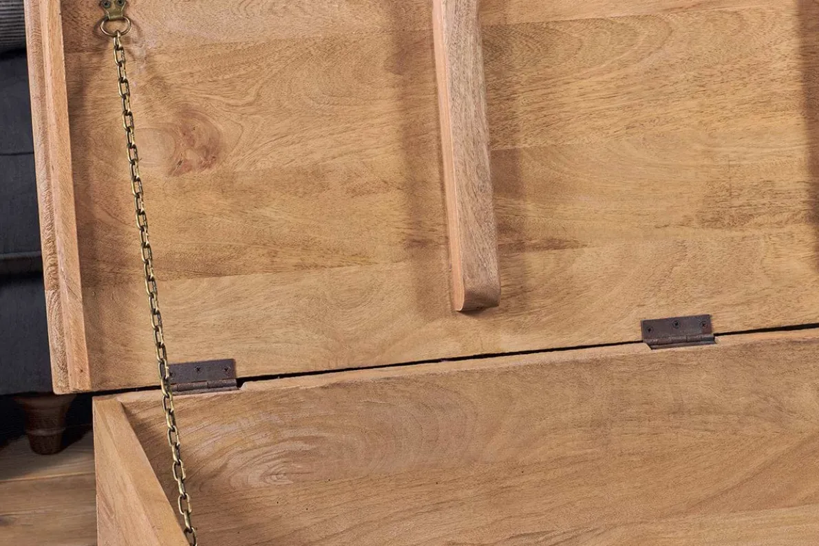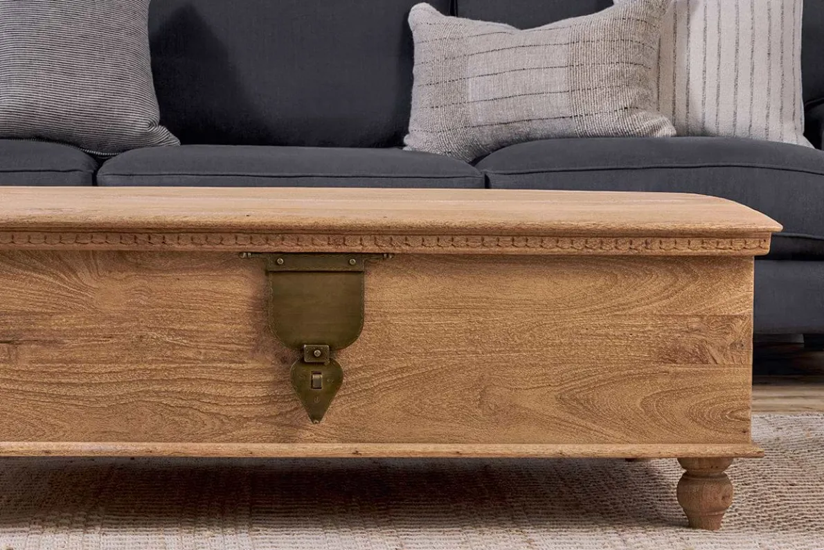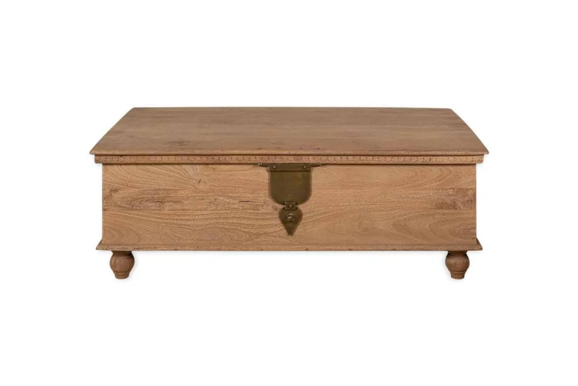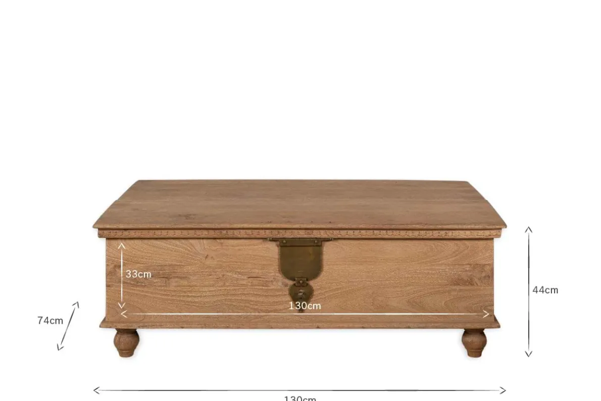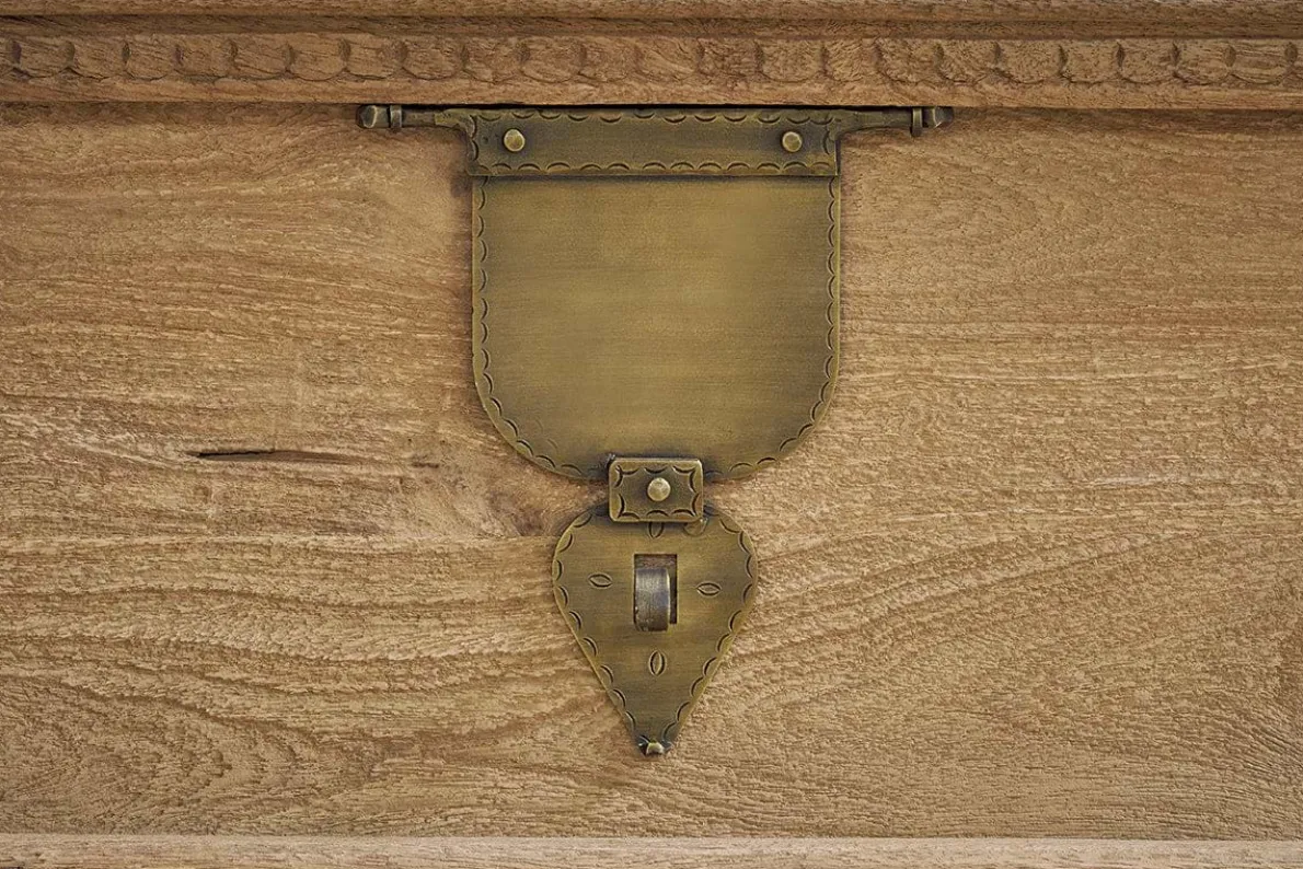 This traditional looking mango wood Vidur chest, modelled on an antique Indian design, adds real character to any living space. Solid and extremely sturdy, with carved details, hand-turned feet and hand-forged hardware, it adds interest to a living room and is perfect as a coffee table with a lamp, decorative objects or candles arranged on the top, or at the end of a bed. Equally, its voluminous storage makes it ideal for keeping spaces such as a hallway or boot room uncluttered.