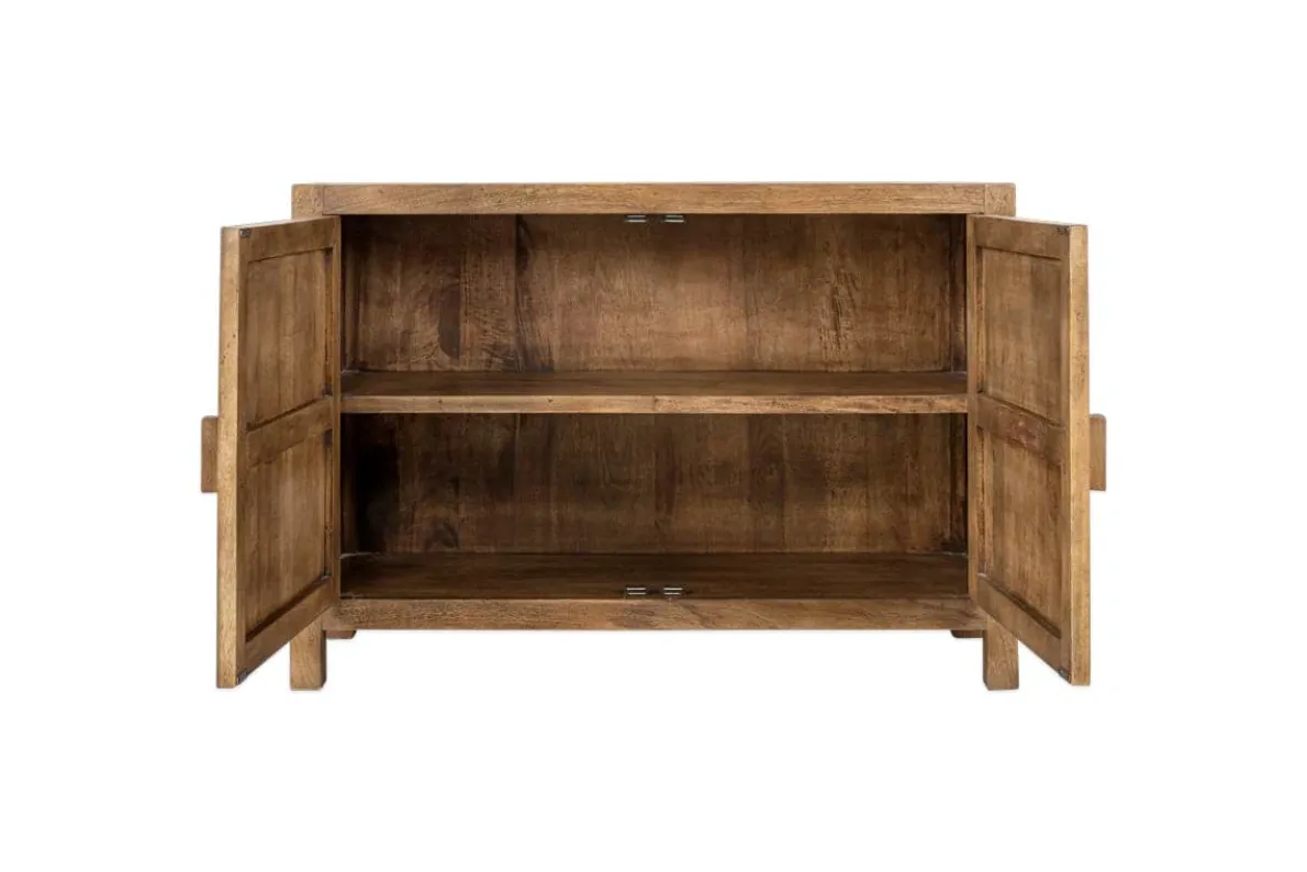 Our Yasha sideboard, made from sustainable mango wood, has a beautiful patina and is finished with a walnut wash. Block handles and a simple reeded design on the front panels add interest and texture. The piece is raised off the ground giving it a light and airy feel, perfect for a hallway, landing or bedroom. There is one inner wooden shelf providing storage. A cabinet is also available in the collection.