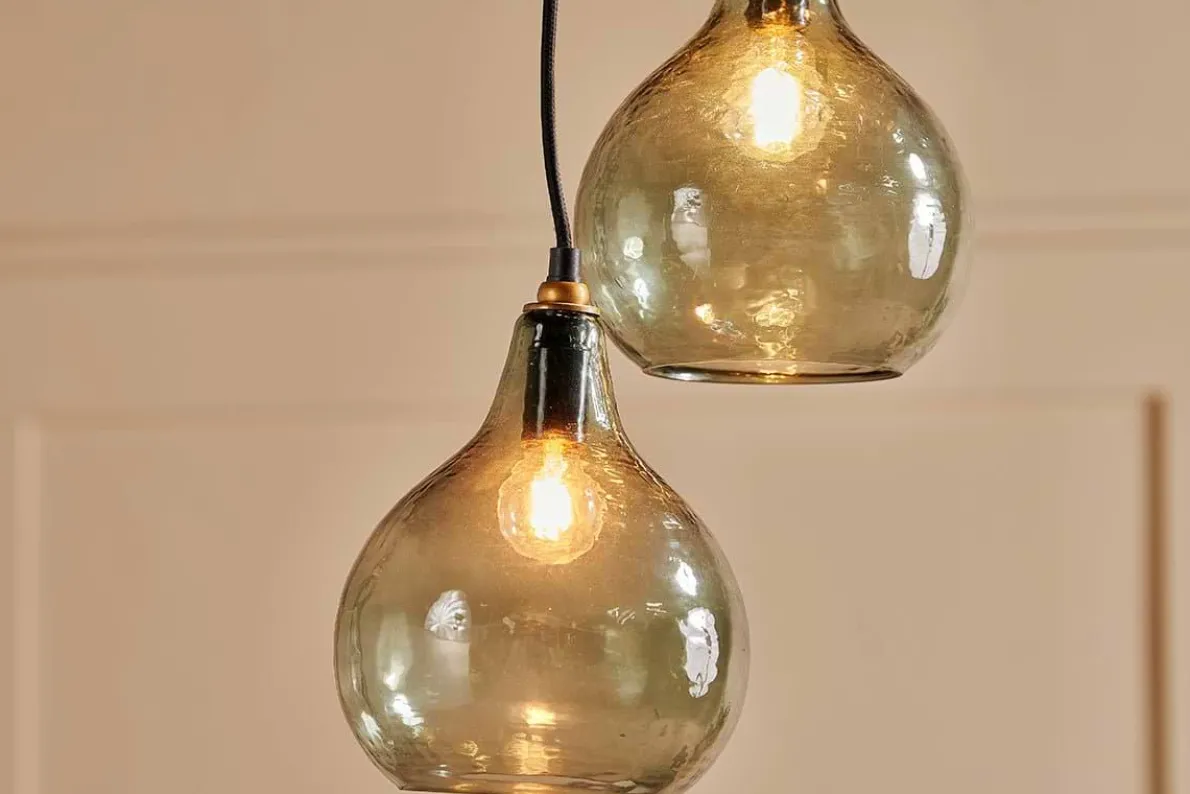 The smoke-coloured hues of the Zia cluster pendant light combine beautifully with the hammered finish of the glass. Each tear shaped pendant is expertly crafted from recycled glass. The six pendants hang at varying heights, creating a dramatic display that promises to enhance a dining space or hallway. The Zia cluster pendants have a black fabric cable and aged brass ceiling rose that add the finishing touch to this unique feature light. The design of the Zia is well suited to high ceilings.