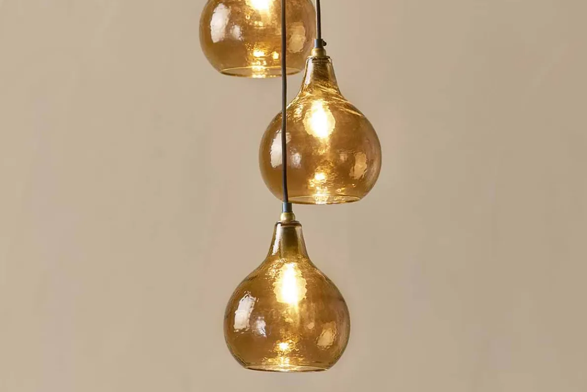 Each glass pendant in this cluster light is hand-blown into an organic, tactile shape, and finished in a smoke brown colour, a perfect neutral palette that imparts softness and warmth whether the bulbs are on or off. Featuring six shades that can be hung at varying heights to fit your specific space, this dramatic arrangement is ideal for high ceilings in dining spaces or hallways. The cluster includes black fabric cables and an aged brass ceiling rose and the recycled glass shades have a hammered finish, making each piece distinctively elegant. This is a beautifully sophisticated fixture that makes an eye-catching addition to your home.