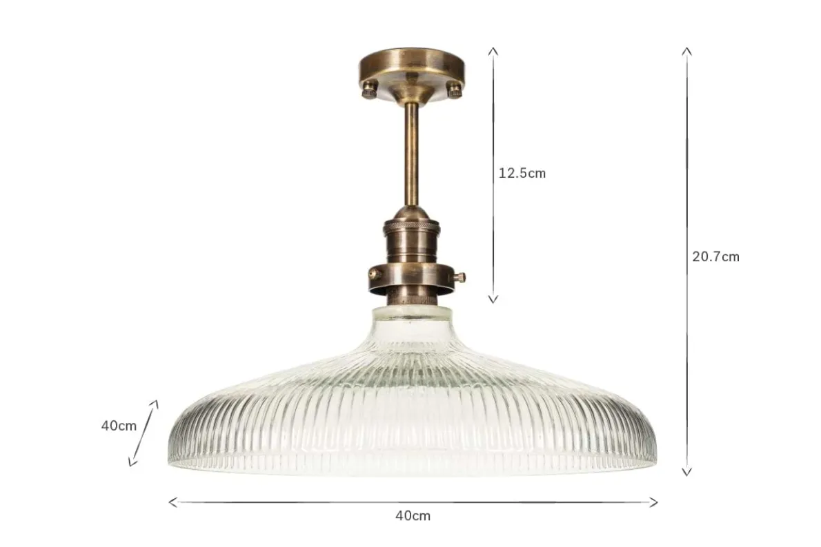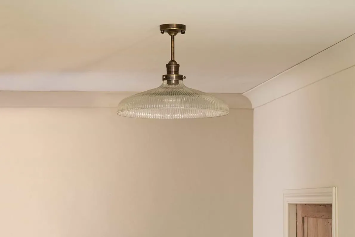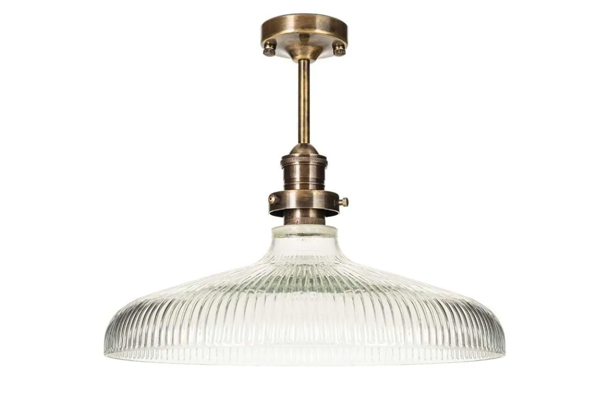 Our Zowie ceiling light has a truly timeless quality. With its shallow design and clear ribbed glass, it maximises the amount of light on display and creates an inviting ambient glow. The textured glass also adds a beautiful decorative detail, as well as an appealing tactile quality. Metal fittings in warm antique brass complete the look. The light is crafted from recycled glass, making it as sustainable as it is elegant. Position over a dining table or kitchen island for a sophisticated aesthetic.